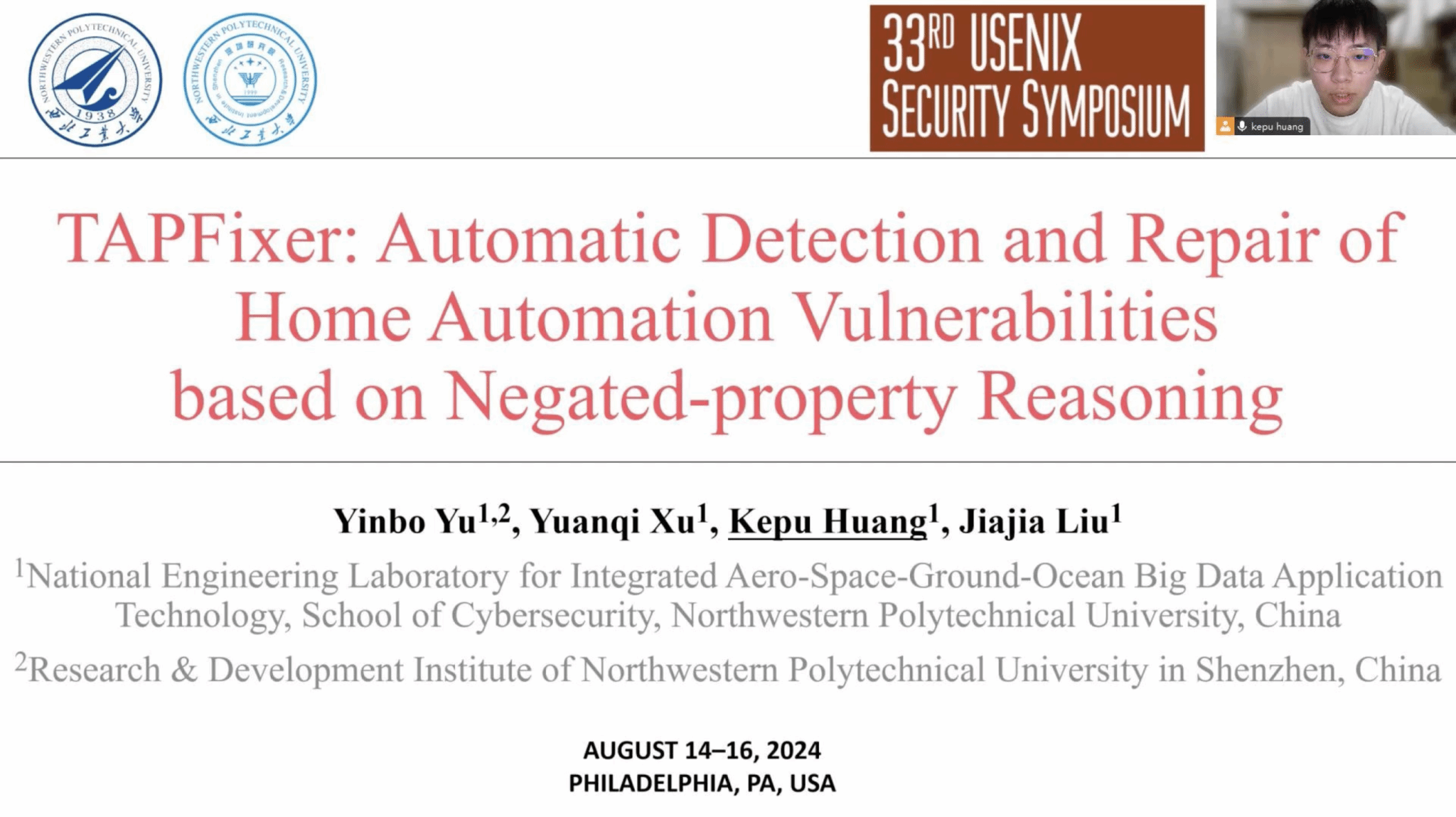 第33届国际网络安全顶会USENIX Security于2024年8月14日-16日在美国宾夕法尼亚州的费城召开。伟德国际bevictor于银菠副教授研究成果“TAPFixer: Automatic Detection and Repair of Home Automation Vulnerabilities based on Negated-property Reasoning”全文被USENIX Security大会正式发表,2023级硕士研究生黄柯蒲作大会报告。该论文是于银菠副教授专注于网络与软件安全领域研究所取得的重要成果之一,也是伟德国际bevictor官方网站第一篇作为第一完成单位的四大安全顶会文章。论文第一作者为于银菠副教授,2021级硕士研究生徐源琪和2023级硕士研究生黄柯蒲分别为员工第一作者和第二作者,刘家佳教授参与论文指导。