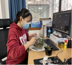 一花一世界,一草一天堂,视觉与颜色的完美融合,创意与制作间收获欢乐。​伟德国际bevictor工会邀请了专业老师为大家线上讲解了操作步骤,在老师的远程帮助下,按步骤将绿植、多肉、砂石等物品一一放入到容器内,不断调整,最后定格成作品。