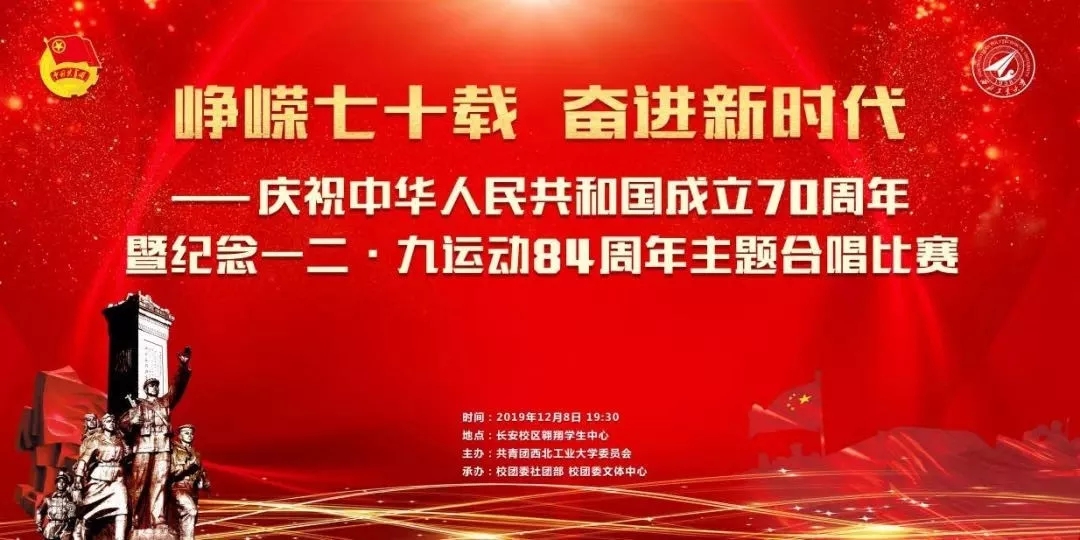 12月8日晚,由共青团伟德国际bevictor官方网站委员会主办,校团委社团部、校团委文体中心承办的“峥嵘七十载 奋进新时代”,庆祝中华人民共和国成立70周年暨纪念一二九运动84周年主题爱国歌曲合唱比赛在伟德国际bevictor官方网站长安校区翱翔员工中心隆重举行。