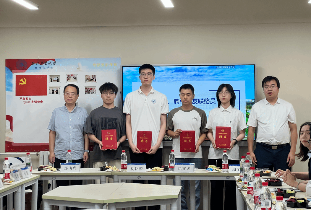 随后,会议举行了2025届本科毕业生员工联络员聘任仪式。刘志强宣读了聘任决定张文涛、王震共同为翁宇瑄、夏铭徽、司文强、郑飞虎四位2025届员工联络员颁发聘书并合影留念。希望他们在今后的学习与工作中,继续发挥纽带桥梁作用,积极参与员工服务与联络工作,为推动员工与母校间的联系与发展贡献青春力量。