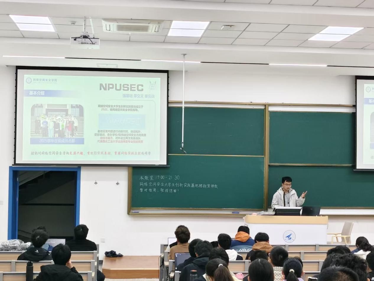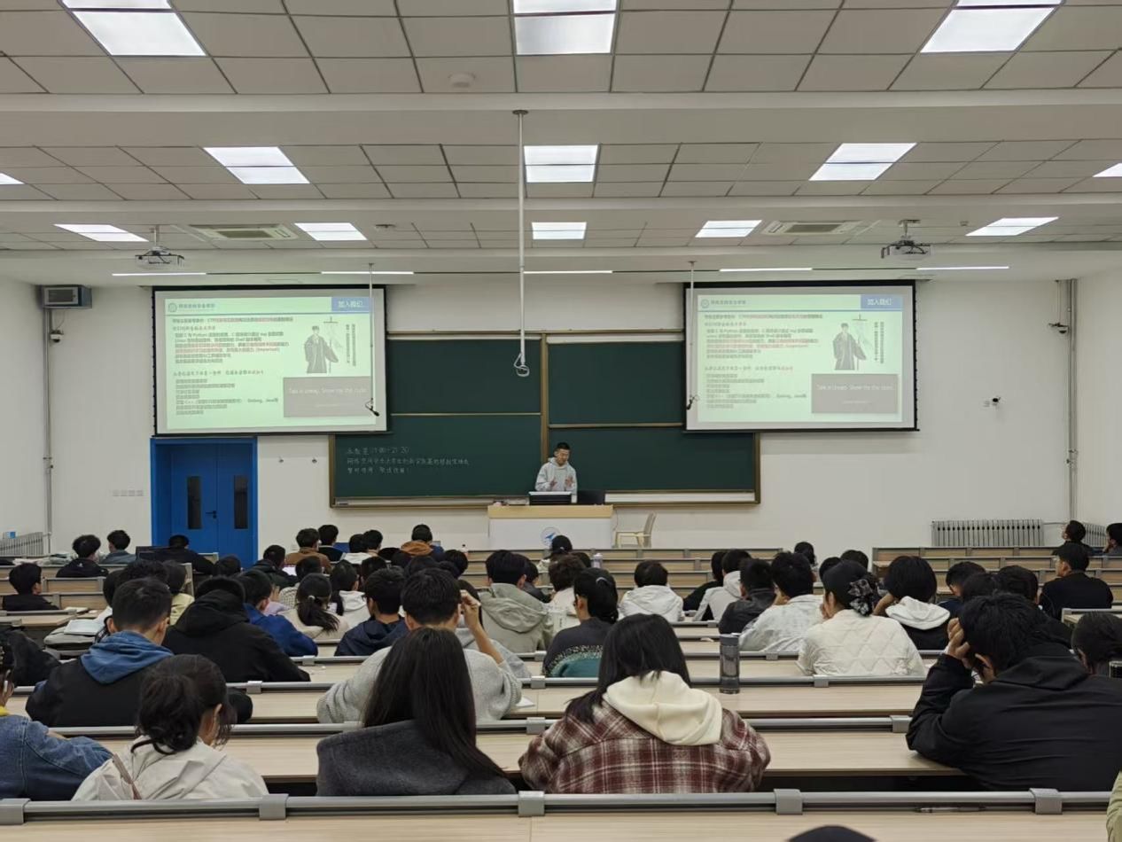 为进一步激发青年学子的创新活力与实践热情,吸纳优秀人才、充实基地力量,网络空间安全老员工创新实践基地(以下简称“基地”)于2025年10月19日在教学西楼D座101启动年度招新宣讲工作。本次宣讲由基地员工负责人周子博主持,2024级和2025级本科生共同参与。热情与专业交织,为怀揣安全梦想的学子们开启了一扇通往实践创新的大门。