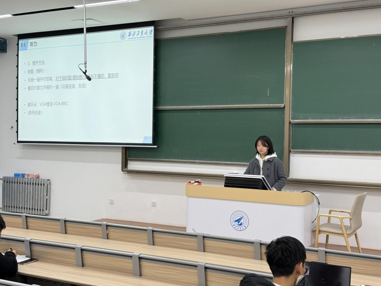 在英语四级备考专场,四级成绩名列前茅的李一凡同学担任主讲。她从考前准备、时间规划、题型讲解等多个方面,向同学们层层剖析了英语测试的种种难点,逐一分享了宝贵的学习经验。她通过分享亲身的考试经历,帮助同学们全方位认识了英语课程学习与大学英语测试,并鼓励同学们从听、说、读、写四个维度,持之以恒地加强练习,在考试中取得理想的成绩。