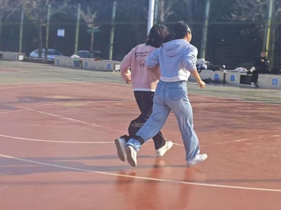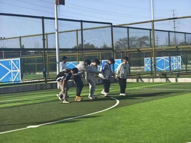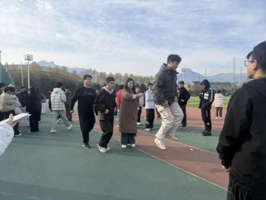 11月底,星天苑操场趣味赛精彩纷呈。先是“两人三足”项目火热开场,每队10人两两分组,跑道两侧分别安排两组和三组,以迎面接力形式展开角逐。赛前,裁判给首发队员发放捆绳,队员绑好相邻脚踝后出发,抵达对侧解下捆绳交给下一组队员继续,直至5组全部完成接力,最终按全队总用时排名,用时最短的前两支队伍获奖。发令枪响,第一组队员如“连体飞人”般高呼号子并肩疾驰,每一次交接与绑绳都是信任与默契的考验,赛道旁呐喊助威声此起彼伏,