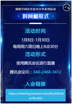 本次活动时间为1月8日-1月30日,于每周周六周日晚上8点30分进行线上分享,活动包含8次技术分享:
