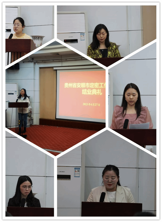 4月27日,在正禾酒店东三会议室举办了贵州省安顺市定密工作培训班结业典礼,结业典礼由本次培训班班主任张勃妮主持。会议第一项由6个小组代表分别发言交流,接着由培训班班长市委办公室市督查督办局副局长朱世燕同志作培训总结汇报,随后罗祝锋副秘书长为各小组颁发结业证书,最后全体参训学员观看了培训期间的剪影。