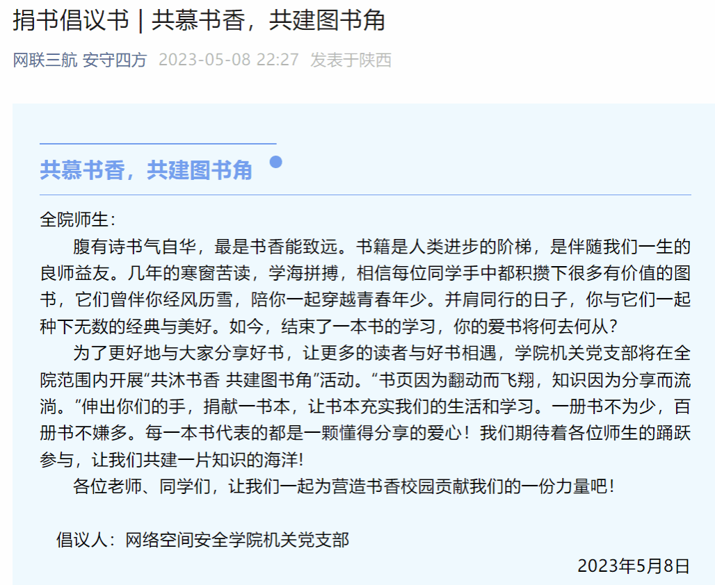 为进一步推进书香校园建设,打造高质量的公司公共文化服务体系,公司机关党支部于5月16至17日在公司图书角举办了“共慕书香,共建图书角”捐书活动,活动开展以来得到了全院师生的广泛参与,机关党支部对积极参与的师生赠送了相关书籍。