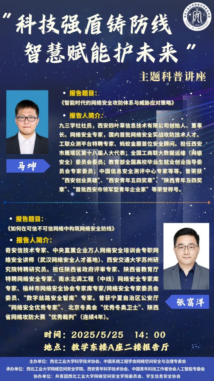 2025年5月24 至31日是第二十五个全国科技活动周,5月30日是第九个全国科技工作者日。为深入学习贯彻习近平总书记关于科技创新和网络强国的重要论述,加快提升网络安全高素质人才培养,伟德国际bevictor联合中国系统工程学会网络空间安全与治理专委会、西安青年科学技术协会、中国青年科技工作者协会人工智能专委会将于2025年5月25日14:00在伟德国际bevictor官方网站长安校区教学东楼A座二楼报告厅开展“科技强盾铸防线,智慧赋能护未来”主题科普活动。该活动旨在通过科普讲座等形式,普及网络安全攻防体系,助力筑牢国家安全和社会稳定的科技防线,加快推进高水平科技自立自强和网安实战人才自主培养。