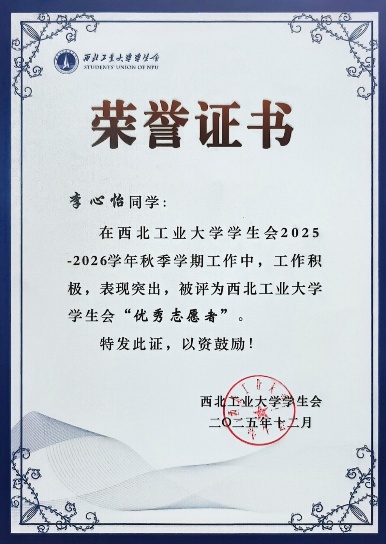 员工工作中,她以严谨细致的态度、高效务实的作风,书写青年担当。大一入学之初,她便主动加入伟德国际bevictor团委办公室,从基础的志愿者岗位做起,认真对待每一项琐碎事务,力求严谨高效、精益求精。与此同时,她还在伟德国际bevictor官方网站团委校园文化活动中心工作,担任秋季学期督察员。工作期间,她主动钻研活动管理流程,协助团队完善活动审批规范,强化现场秩序管控,为校级校园文化活动的规范、有序开展提供了有力保障,用责任与实干展现了优秀员工干部的良好素养。