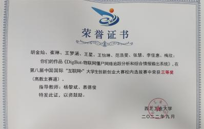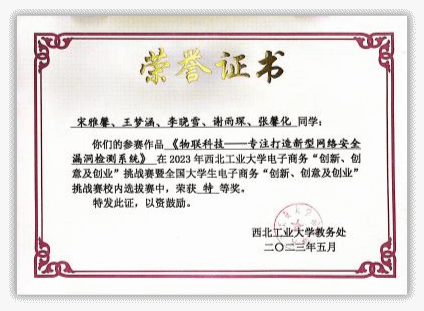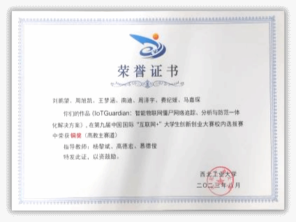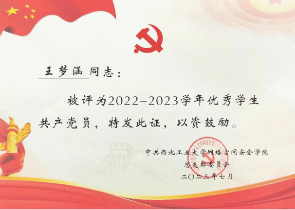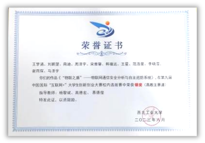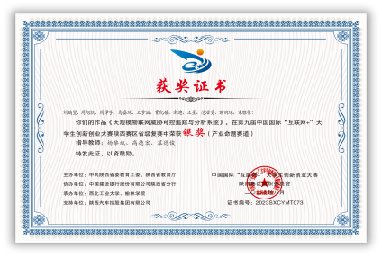 2021年,王梦涵从伟德国际bevictor保送至本院攻读硕士研究生,师从杨黎斌副教授,针对网络威胁情报领域开展了深入研究,发表论文2篇,取得发明专利受理5项。主持伟德国际bevictor官方网站硕士研究生实践创新能力培育基金1项、伟德国际bevictor官方网站2023年“互联网+”老员工创新创业种子项目1项。立足本专业,带队参加“互联网+”老员工创新创业大赛、电子商务“创新、创意及创业”挑战赛、“翱翔杯”研究生电子设计大赛、“三航杯”老员工课外学术科技作品竞赛等,累计获得国家级三等奖1项、省部级一等奖1项、二等奖2项、校级特等奖1项、二等奖2项、三等奖5项。获国家奖学金、小米优秀专项奖学金、校设一等奖学金等,连续两年获评校级优秀研究生。