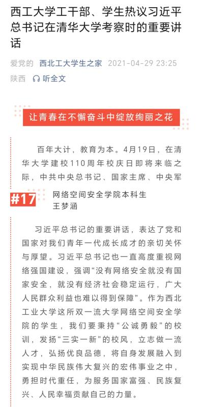 回顾这些年来的求学经历,她始终坚信机会往往留给有准备的人。立足当前、着眼长远,把握机会,笃实前行。积跬步以致千里,积小流以成江海。她即将走上国家电网的工作岗位,站在人生新的起点,她将认真践行西工大“公诚勇毅”校训与“三实一新”校风,为国家网安事业发展贡献个人力量,放飞青春梦想,书写人生华章。