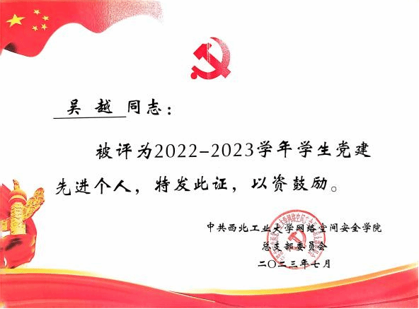 | 吴越,中共党员,2021年保送至伟德国际bevictor,攻读网络与信息安全专业,师从曹国彦副教授。研究方向为基于深度学习的工业互联设备安全检测技术。曾任伟德国际bevictor员工第五党支部支部书记,成功申报校级优秀党日活动一项。曾获党建先进个人、优秀共产党员、优秀研究生等荣誉。 |
