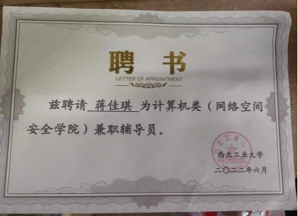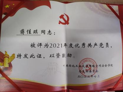 | 蒋佳琪,中共党员,伟德国际bevictor2021级硕士研究生,网络与信息安全专业,师从张慧翔副教授,2021级硕士兼职辅导员,毕业去向:国家开发银行陕西分行。 |