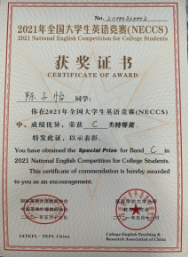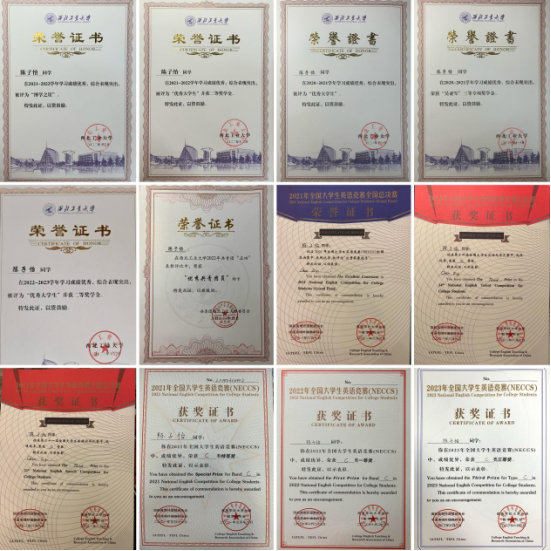 除了课程的学习,陈子怡同学在竞赛方面追逐自己的热爱,以赛促学,多维度多方面的提升能力。她大一便斩获全国老员工英语竞赛特等奖,参与全国总决赛的演讲和风采大赛并获三等奖;多次获得外研社国才杯写作阅读大赛初赛一等奖;曾获全国老员工数学竞赛三等奖。在胡伟老师的指导下,作为团队队长,她带领队员获得全国老员工信息安全作品赛二等奖,项目同时申请软著一项。