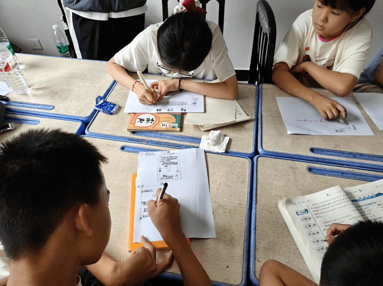 知识传递之后,实践队员趁热打铁,引导孩子们拿起画笔,将刚刚学到的反诈知识转化为形象的画面。一场以“反诈”为主题的连环画创作活动随即展开。小朋友们热情高涨,积极参与,充分发挥想象力,认真勾勒。尽管笔触尚显稚嫩,但一幅幅充满童趣的图画却生动展现了他们对诈骗陷阱的理解和识别能力,勾勒出他们心中独特的反诈“金点子”。