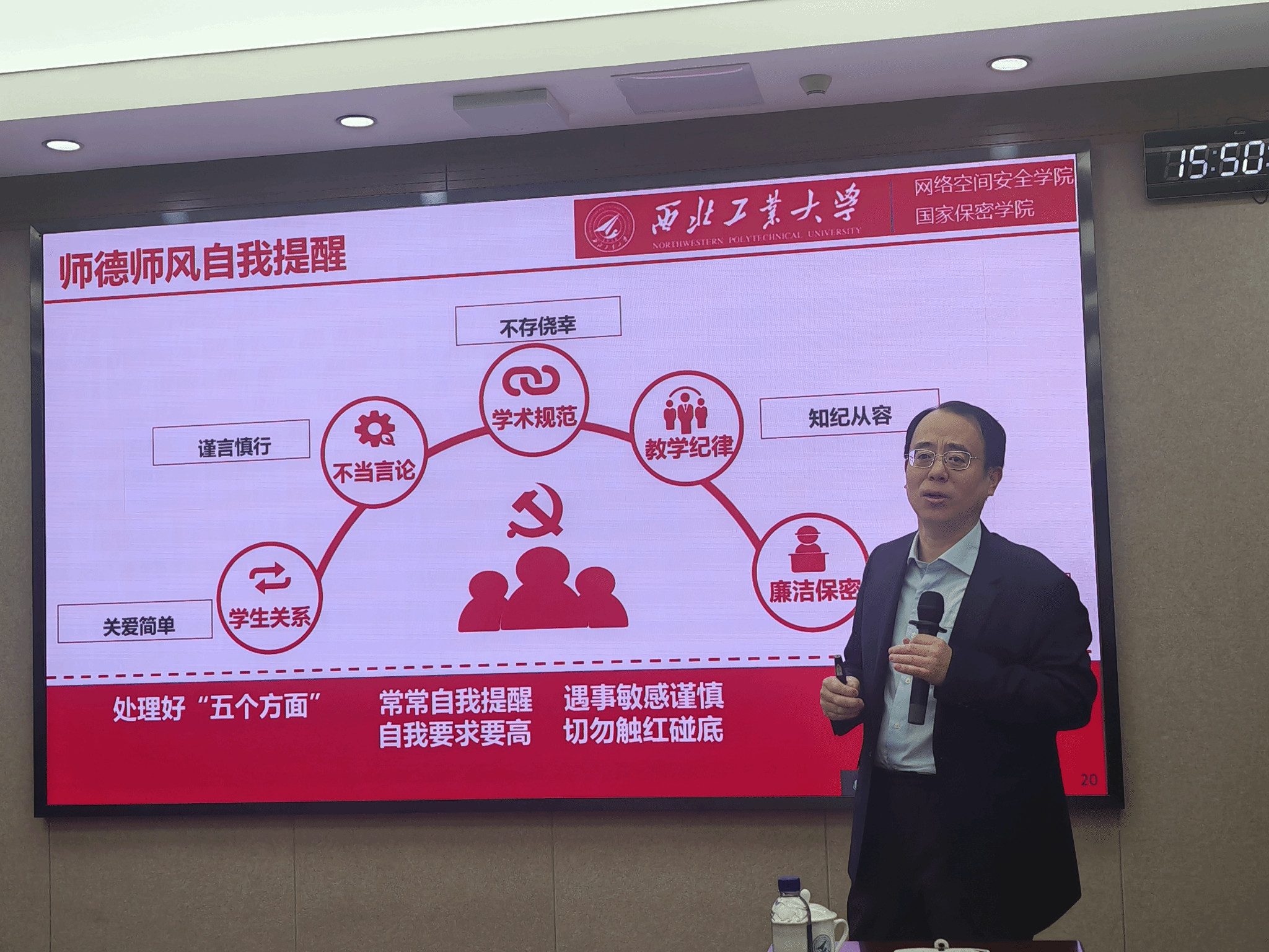 在师德师风培训环节,张文涛结合国家和上级的最新要求,深入解读了教育家精神的内涵。强调每一位教职工都肩负着为党育人、为国育才的神圣使命,在日常教学、科研指导以及与员工相处的点滴中,都要以 “学高为师,身正为范” 为准则。并从持续加强教师思政工作、健全师德师风长效机制、高校教师职业行为准则、高校教师师德失范行为相关惩处等方面开展了培训。