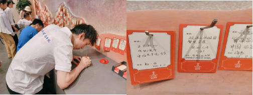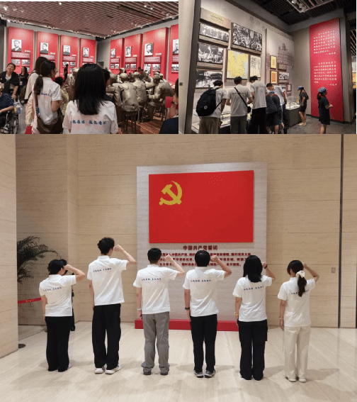 在参观完展厅中 600 余件文物实物、近 1000 张历史照片、40 余组场景复原后,师生们深受触动,面向党旗庄严列队,齐声重温入党誓词。