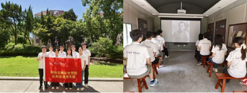 而在四行仓库遗址,西墙上430余个弹孔如凝固的泪痕,将“八百壮士”的史诗镌刻其上。队员们在“团副训话”雕塑前屏息凝神,谢晋元将军穿越80年的呐喊仿佛仍在耳畔,如惊雷炸响在灵魂深处。指尖轻抚弹孔,历史的温度从掌心蔓延至心尖,让这群新时代的网安学子更加读懂了守护国家“第五疆域”的使命担当。